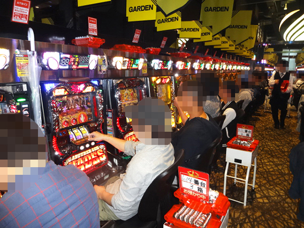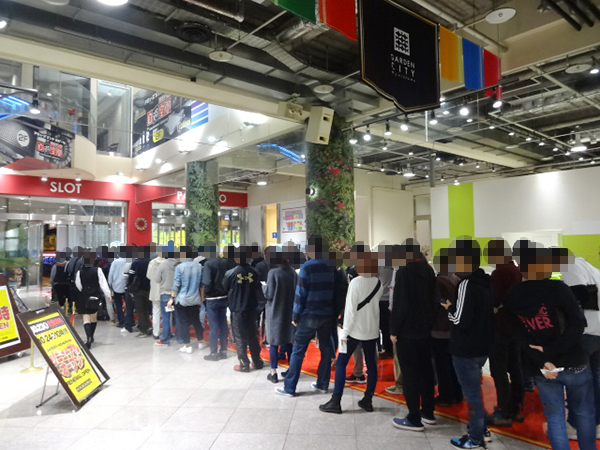 取材当日の朝はあいにくの空模様だったものの、開店前から160人近くのプレイヤーが集結。各人、胸を高鳴らせつつ、入店の瞬間が来るのを心待ちにしていた。