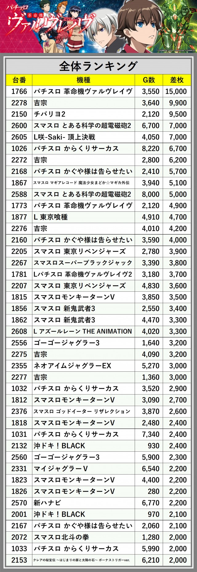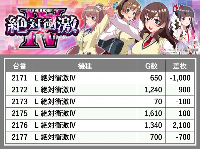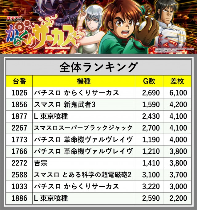 厳選された取材対象機種をはじめ、その他スロット全体から好記録が飛び出した!プレイヤーが楽しんだ1日を下記データにて振り返ってみて欲しい。