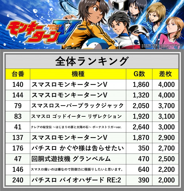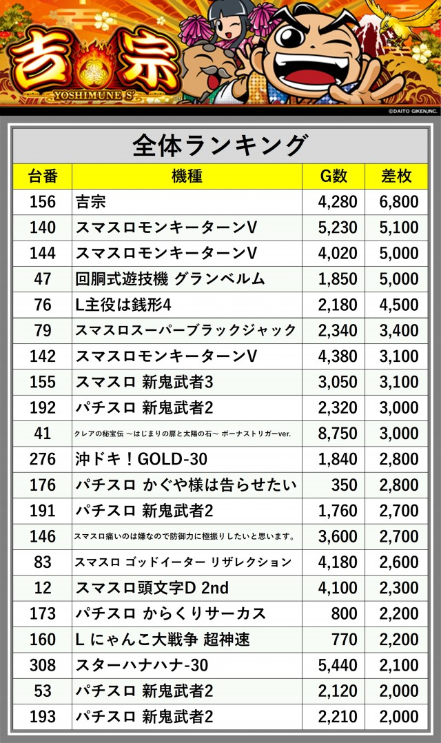 厳選された取材対象機種をはじめ、その他スロット全体から好記録が飛び出した!プレイヤーが楽しんだ1日を下記データにて振り返ってみて欲しい。