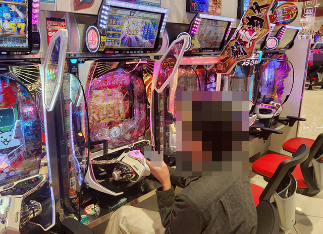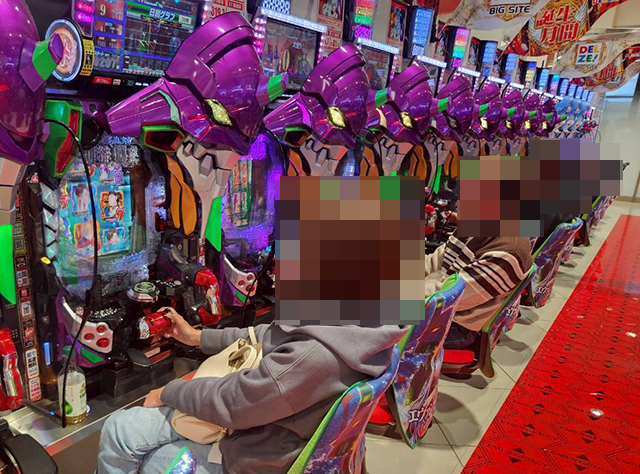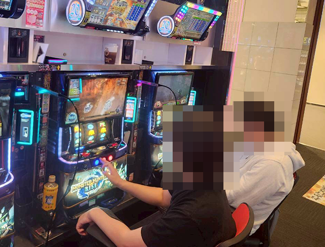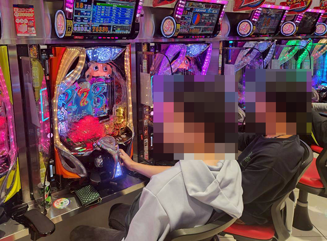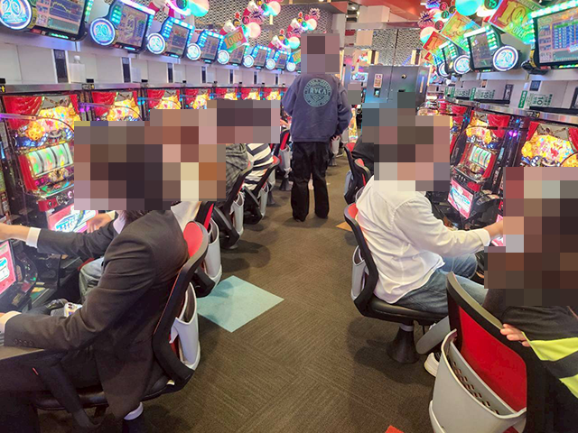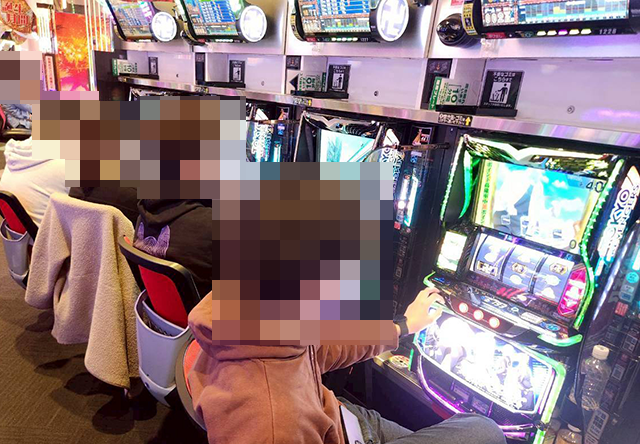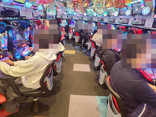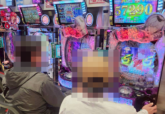 「マイジャグラーⅤ」や「ドラゴンハナハナ~閃光~ 30」、「キングハナハナ-30」に、楽しそうに遊技をおこなっている姿が並んでいた。