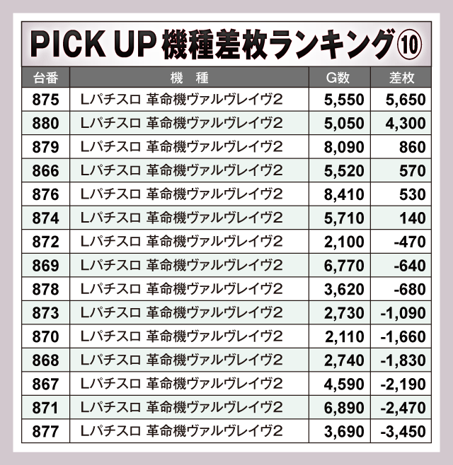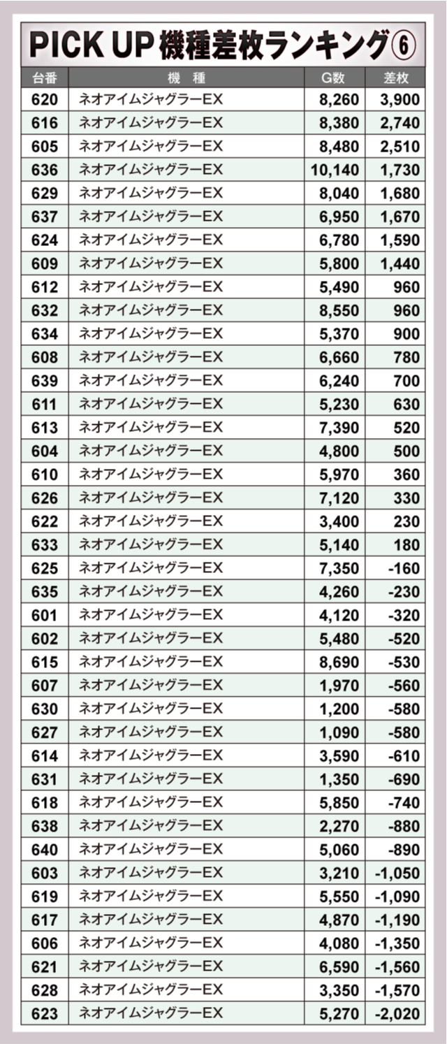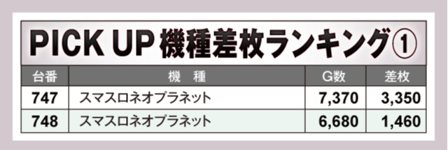 今回のPICK UP機種は全10機種。差枚上位機種以外からも多数の好調台が確認されており、『L 東京喰種』と『Lパチスロ 革命機ヴァルヴレイヴ2』から+5,000枚超、『スマスロ 東京リベンジャーズ』からは+4,180枚が飛び出している。また、Aタイプ機種では『ネオアイムジャグラーEX』が大奮闘!! 最終的に半数の台がプラス差枚となっているだけに、ファンにとって充実の一日となったのは間違いないだろう。