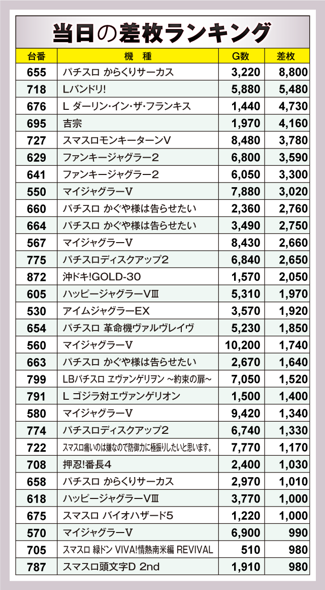 ※差枚数順に掲載しています。