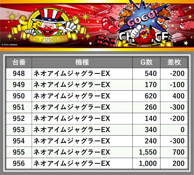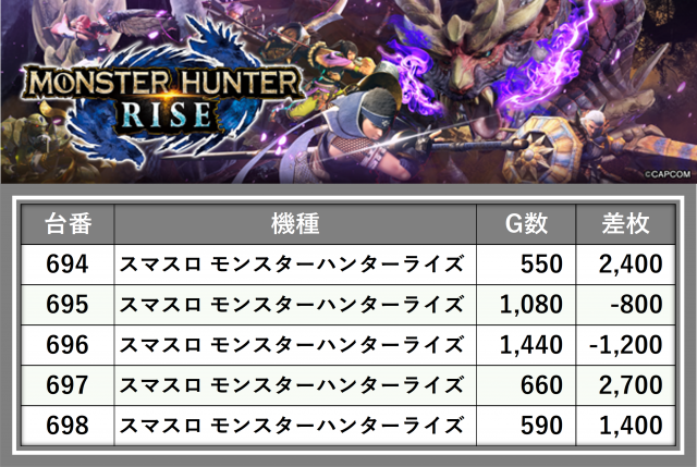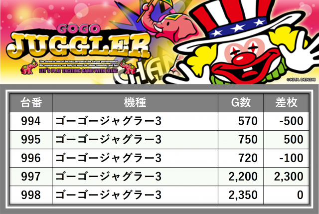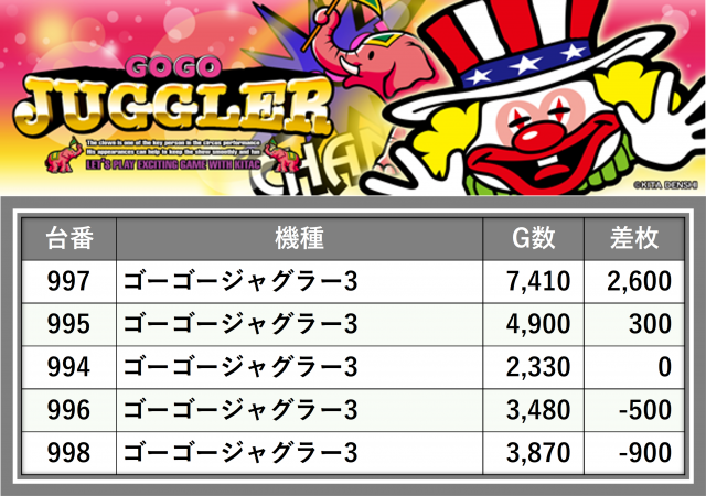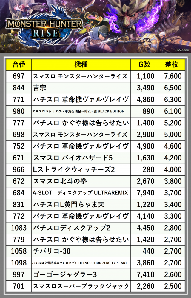 厳選された取材対象機種をはじめ、その他スロット全体から好記録が飛び出した!プレイヤーが楽しんだ1日を下記データにて振り返ってみて欲しい。