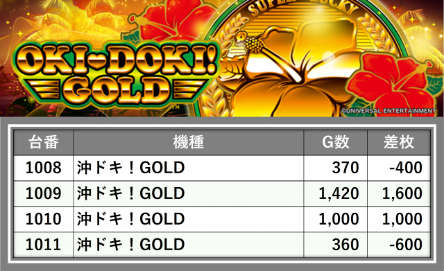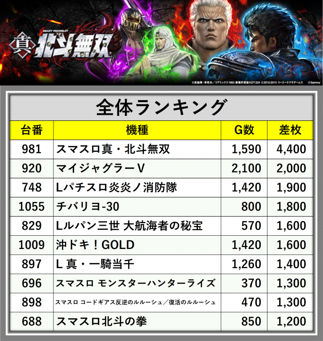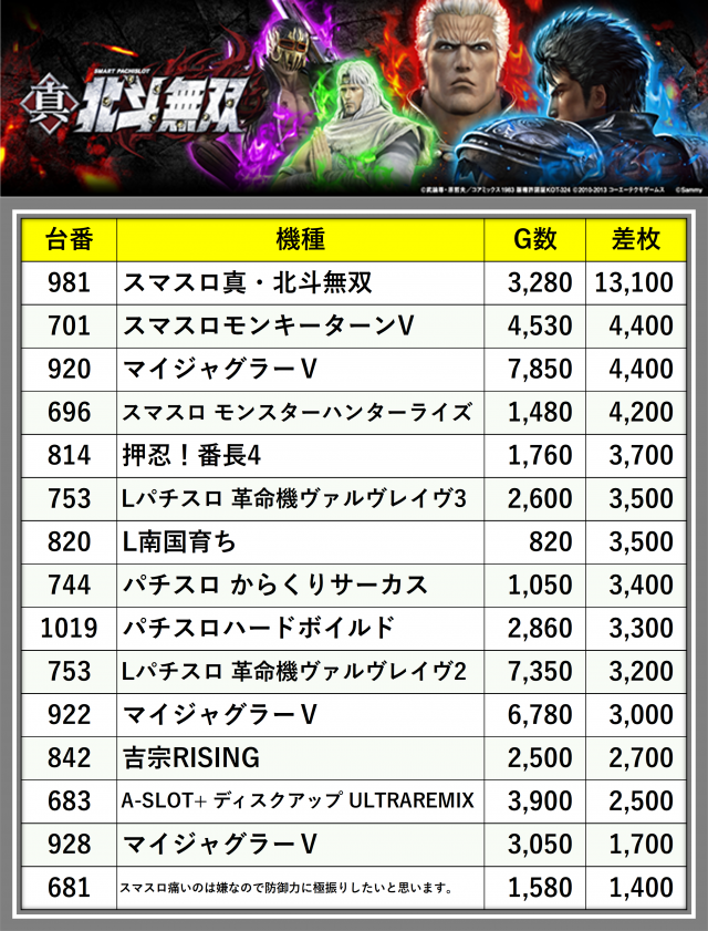 厳選された取材対象機種をはじめ、その他スロット全体から好記録が飛び出した!プレイヤーが楽しんだ1日を下記データにて振り返ってみて欲しい。