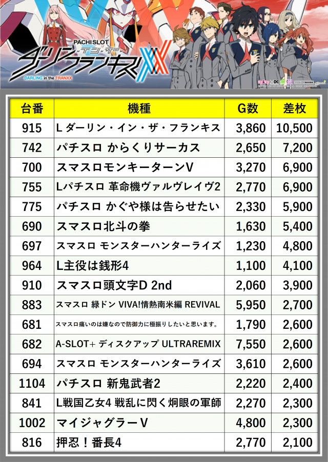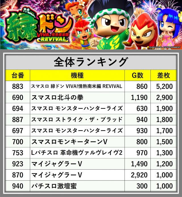 厳選された取材対象機種をはじめ、その他スロット全体から好記録が飛び出した!プレイヤーが楽しんだ1日を下記データにて振り返ってみて欲しい。
