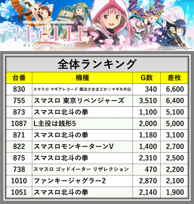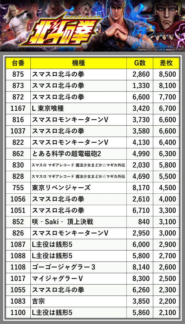 厳選された取材対象機種をはじめ、その他スロット全体から好記録が飛び出した!プレイヤーが楽しんだ1日を下記データにて振り返ってみて欲しい。