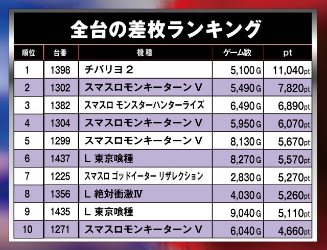 続いては「楽園浜松ザザシティ店」の「全台差枚ランキング」を見ていこう。トップの「チバリヨ2」の万枚オーバーを始め、9位までが+5,000枚以上のハイスコアをマークしている点が特徴。機種別で見ると「スマスロモンキーターンV」から4台、「L 東京喰種」から2台がランクインする結果となった。