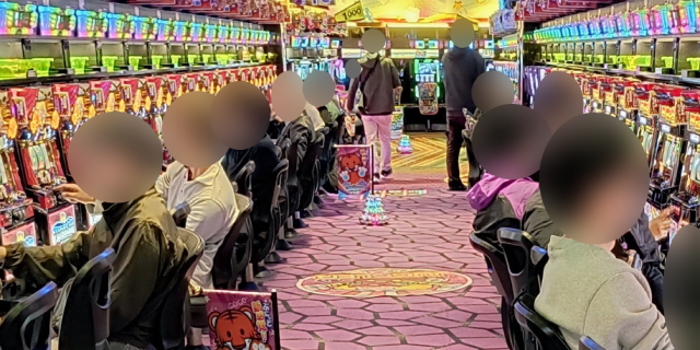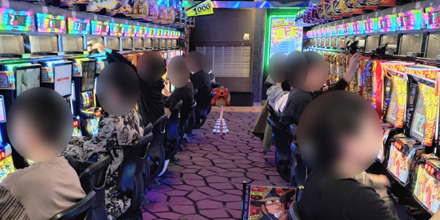 「楽園上新屋店」は、9,500G超を筆頭に全台が5,000G以上の稼働を記録し、3035番台が+4,100枚、3040番台が+2,000枚超をマーク。全7台の平均G数は7,390Gとなった。