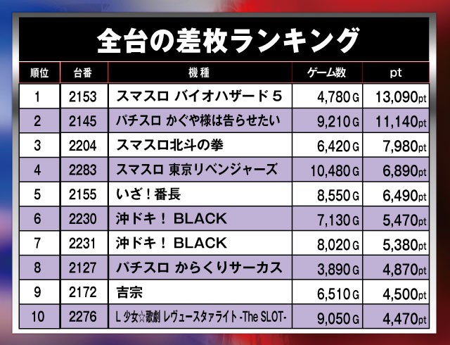続いては当日の「楽園沼津店」の全台差枚ランキングを見ていこう。1位と2位の「スマスロ バイオハザード5」と「パチスロ かぐや様は告らせたい」は+10,000枚超のハイスコアを記録。また、トップ10に9種類のマシンがランクインしており、様々な機種から優秀台が登場した点も見逃せない。