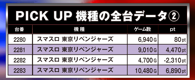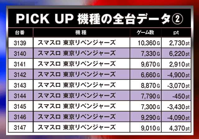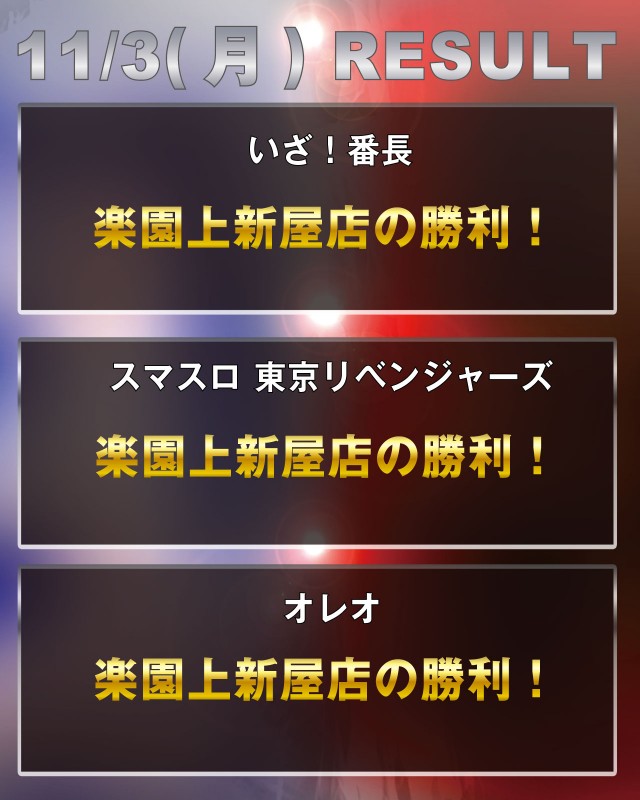 機種対決は「平均G数」が多いほうを勝ちとするため、「いざ!番長」では平均7,390G、「スマスロ 東京リベンジャーズ」では平均8,480Gをマークした「楽園上新屋店」が勝利。賞品対決を含め「楽園上新屋店」が3勝という結果に終わった。