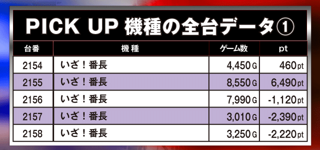 「楽園沼津店」は、8,000Gを超える稼働を記録した2155番台が+6,400枚超を達成したものの、この日は台のポテンシャルを活かしきれない台もあり、全5台の平均G数は5,450Gという結果となった。