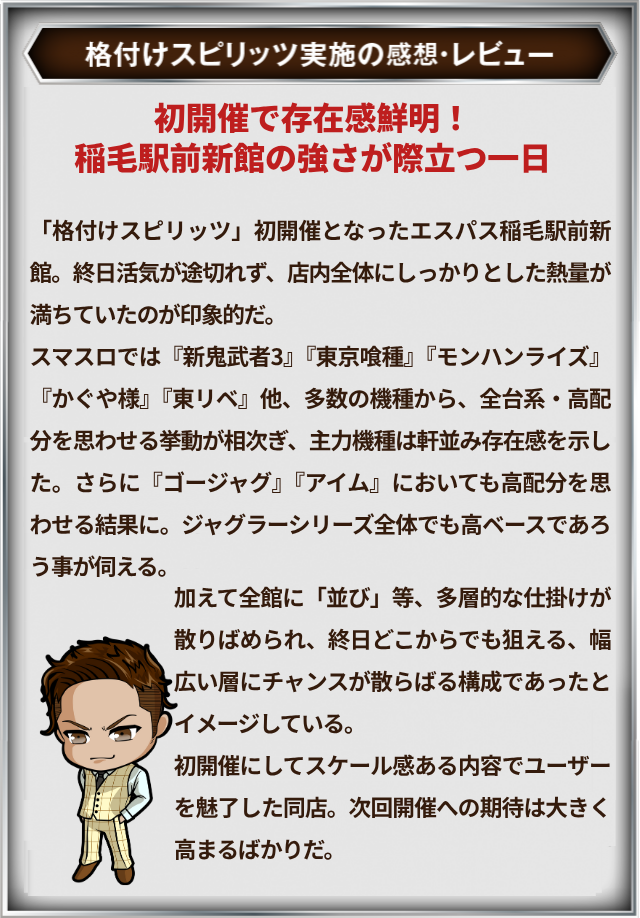 11月8日(土)エスパス日拓稲毛駅前新館にて、DMMぱちタウンの「格付けスピリッツ」を実施。