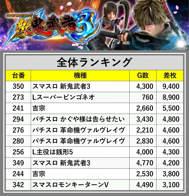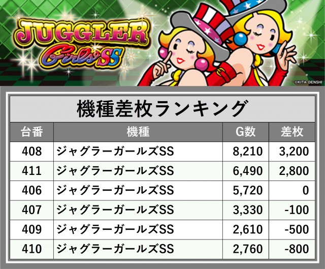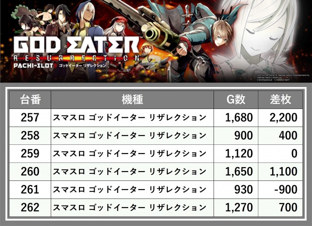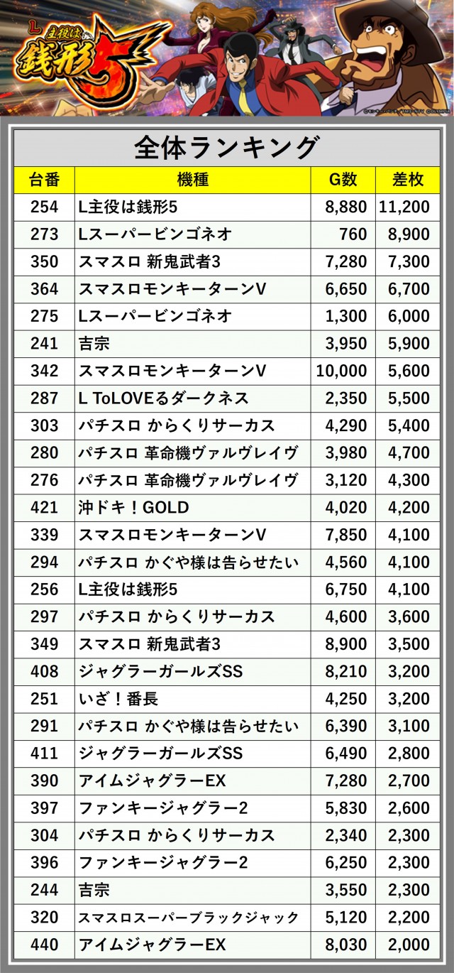 厳選された取材対象機種をはじめ、その他スロット全体から好記録が飛び出した!プレイヤーが楽しんだ1日を下記データにて振り返ってみて欲しい。