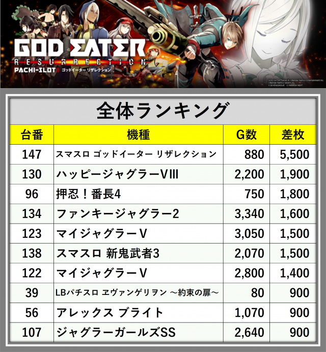 厳選された取材対象機種をはじめ、その他スロット全体から好記録が飛び出した!プレイヤーが楽しんだ1日を下記データにて振り返ってみて欲しい。