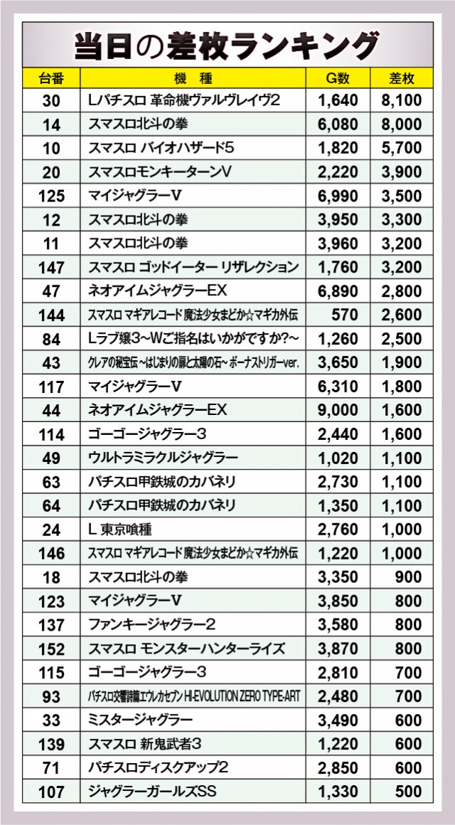 『Lパチスロ 革命機ヴァルヴレイヴ2』『スマスロ北斗の拳』は8,000枚台を記録しており、『スマスロ バイオハザード5』も5,000枚台をマークするなど、大きな熱気が各所で放たれていた。他にもまとまった出玉を確保する台が見られ、ファンは高揚感を抑えきれなかったことだろう。また幅広い機種が名を連ねている点も見逃せず、お気に入りの機種を楽しめる1日になったと言える。