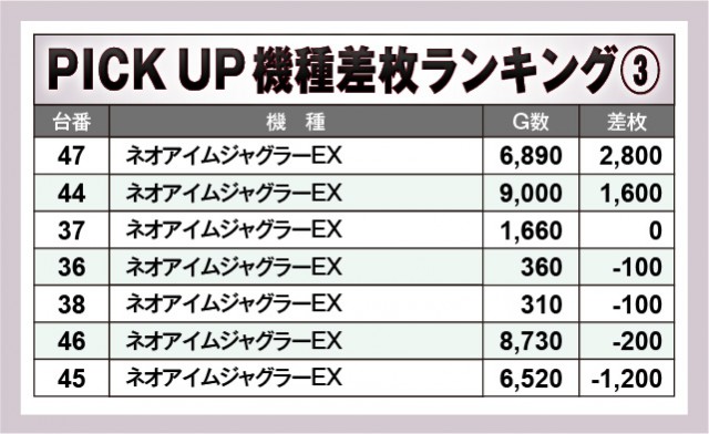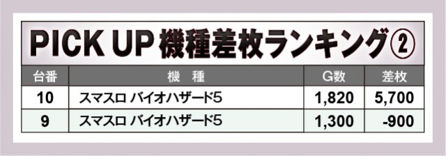 『スマスロ北斗の拳』から8,000枚という記録が放たれ、さらに3,000枚台をマークする台もあって、大きな存在感を放っていたのは間違いない。『スマスロ バイオハザード5』もまた同様に大台突破で気を吐き、店内を盛り上げていた存在と言えよう。また『ネオアイムジャグラーEX』もじっくりと打ち込まれた形跡が見られ、遊技していたファンは手応えを感じながらレバーを叩いていたに違いない。