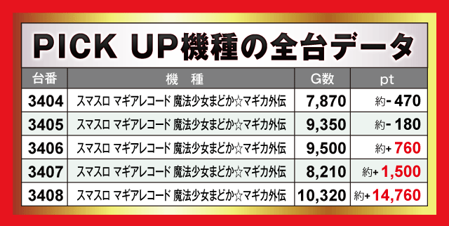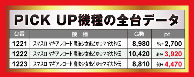 今回の全店共通PICK UP機種は『スマスロ マギアレコード 魔法少女まどか☆マギカ外伝』で、総台数の全17台中10台がプラス差枚に。さらに、平均差枚が+2,400pt超となっているだけに、各店舗のシマ内は終日ファンの笑顔と活気に満ち溢れる一日となった。