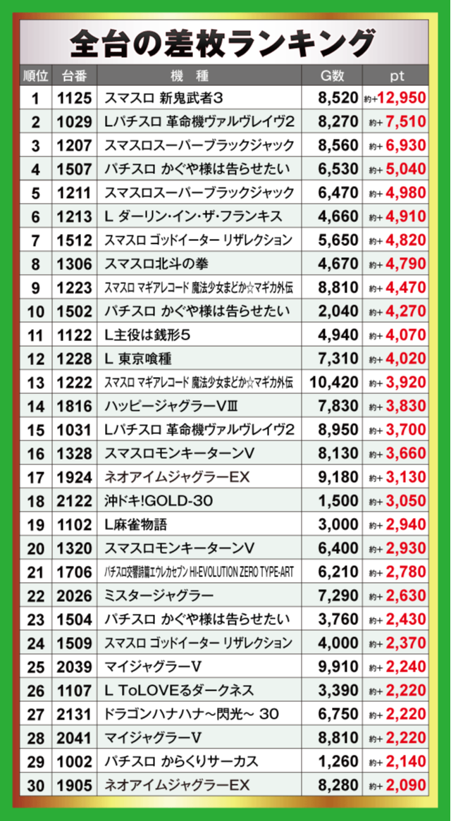 また、その他にも『スマスロスーパーブラックジャック』が+6,000pt超に+4,000pt超とハイスコアを連発。さらに、人気のジャグラーシリーズも奮闘しており、差枚TOP30に6台がランクインするなど、AT機だけでなくAタイプ機種もしっかりと結果を残している。