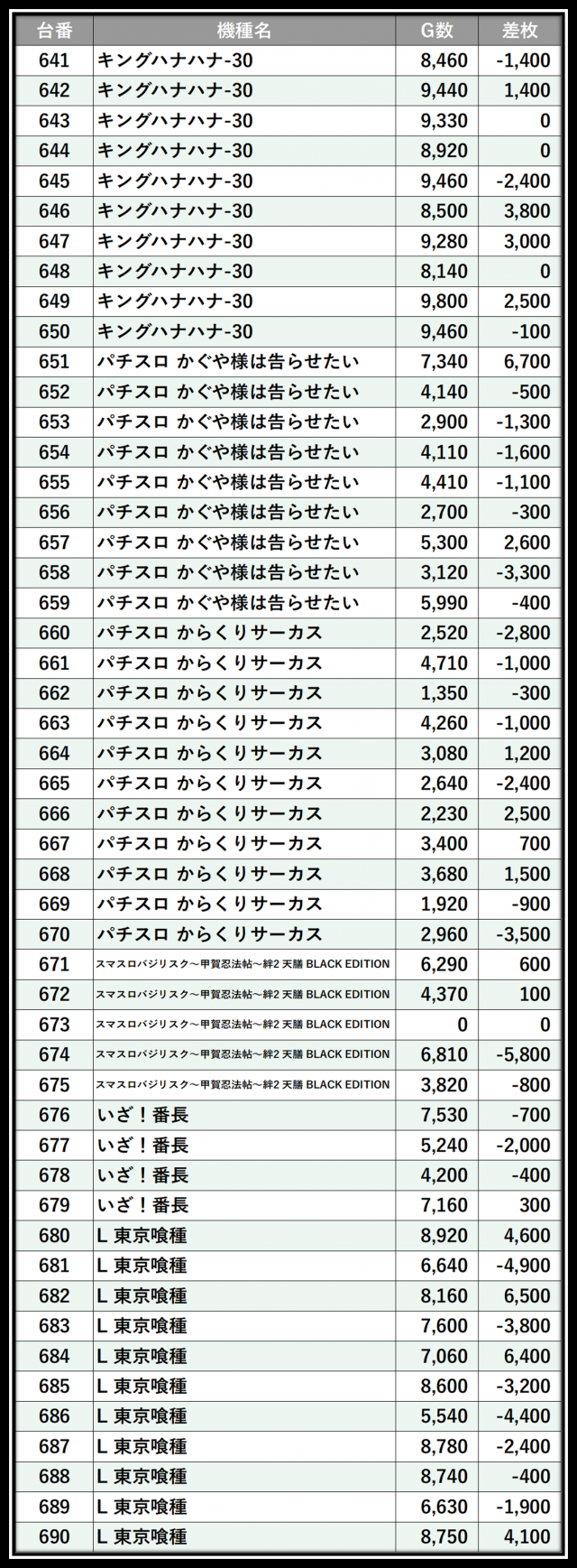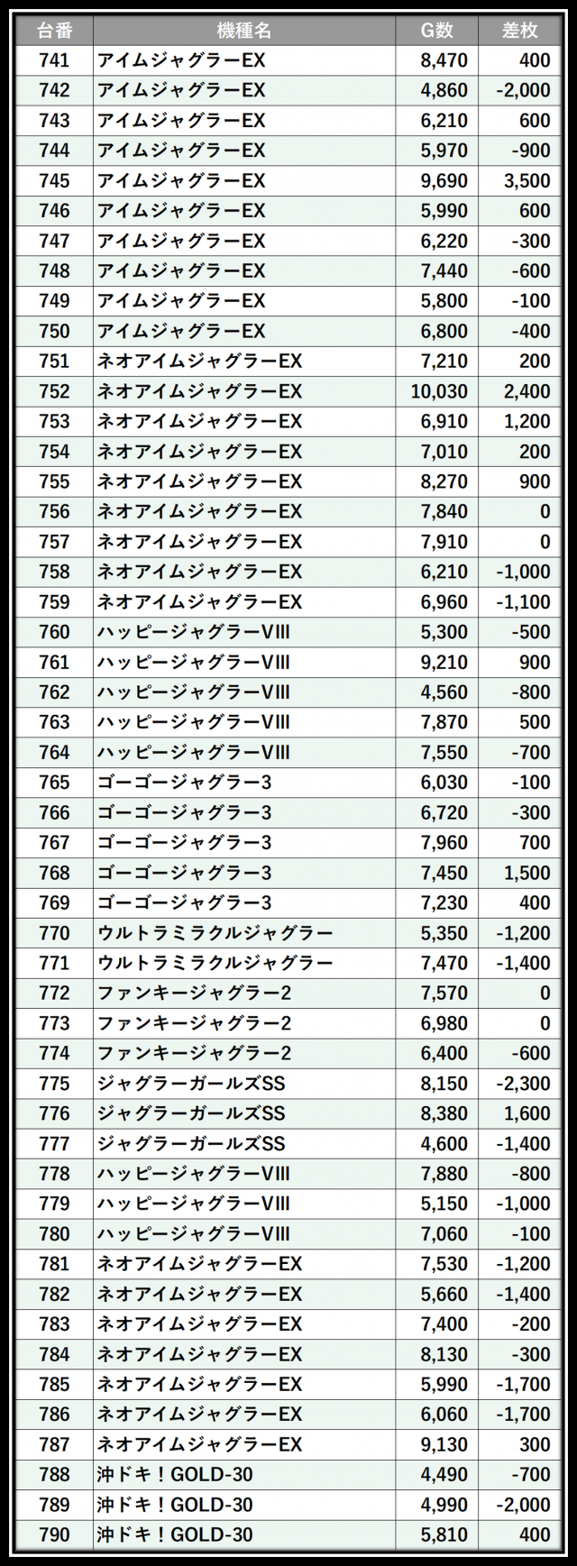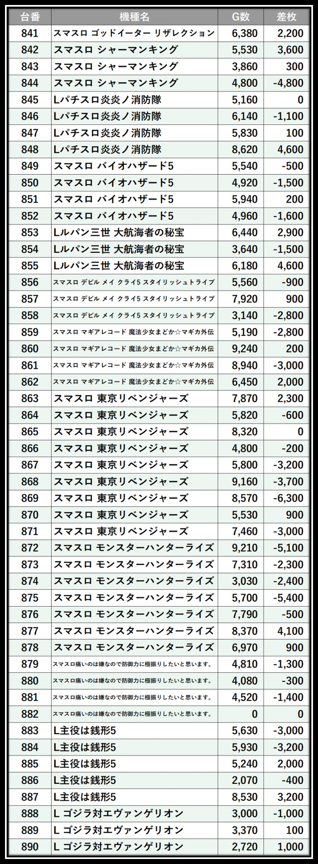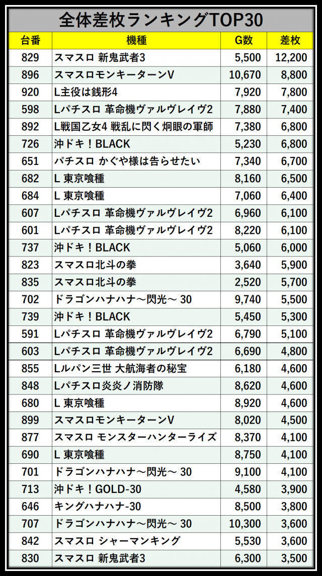 ※差枚数順に掲載しています