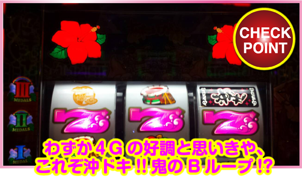 「どうなるものか」と回した投資1本目。なんと4Gでハイビスカスがキラキラと!! 「これが噂のチャンスゾーン??」と期待しながら、他の台の様子を見ると朝イチ、早いゲーム数でハイビスカスが光っているのを確認。異様な様子の沖ドキコーナーw 。