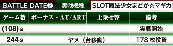 休憩の後、台を物色するものの、状況は変わらず。とりあえず、108Gで置いてあったまどマギで200Gのゾーンまで。