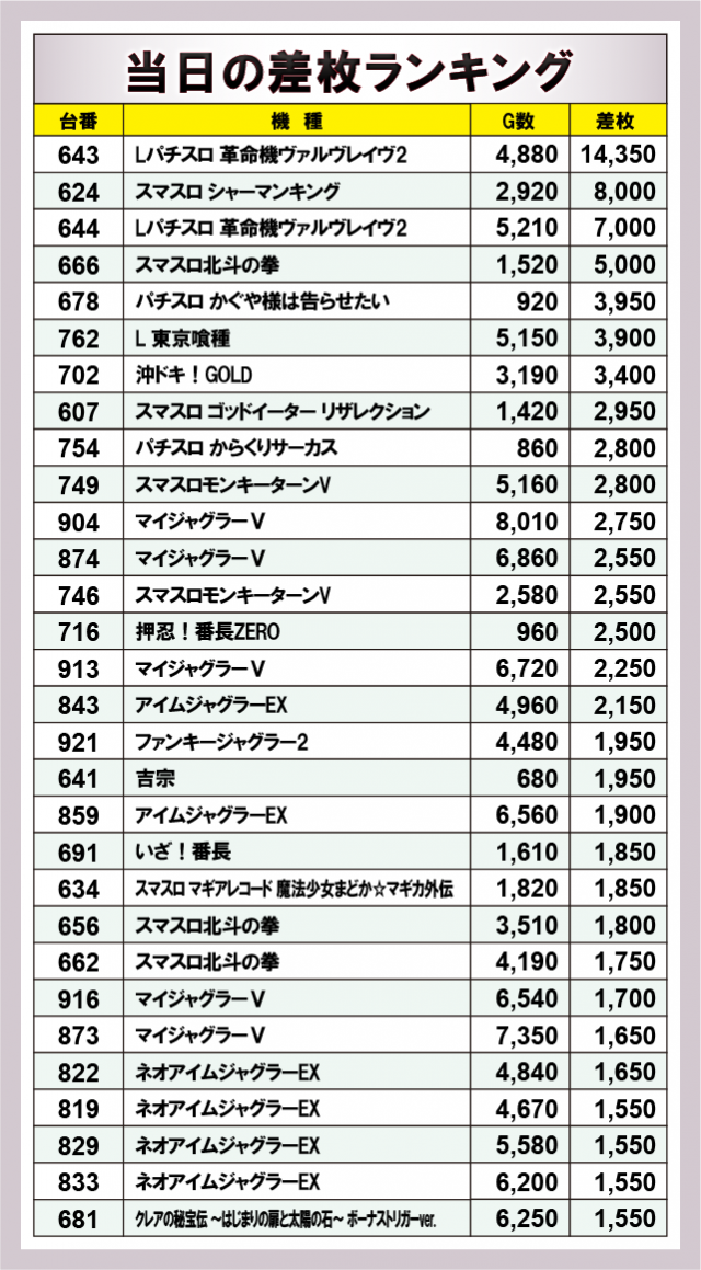 首位に立った『Lパチスロ 革命機ヴァルヴレイヴ2』が+14,350枚という圧巻の差枚を叩き出し、まさにこの日の主役に。続いて『スマスロ シャーマンキング』の+8,000枚、『スマスロ北斗の拳』の+5,000枚と、上位はスマスロ勢がしっかり席巻した。またAタイプでは『マイジャグラーV』『ネオアイムジャグラーEX』などのジャグラーシリーズがしっかり差枚を積み重ね、AT・Aタイプともにまんべんなく好調台が散らばり、フロア全体が息の長い活気を保っていた。