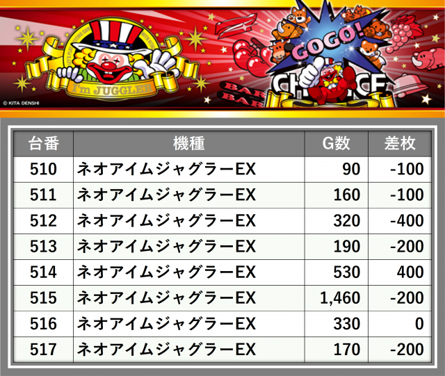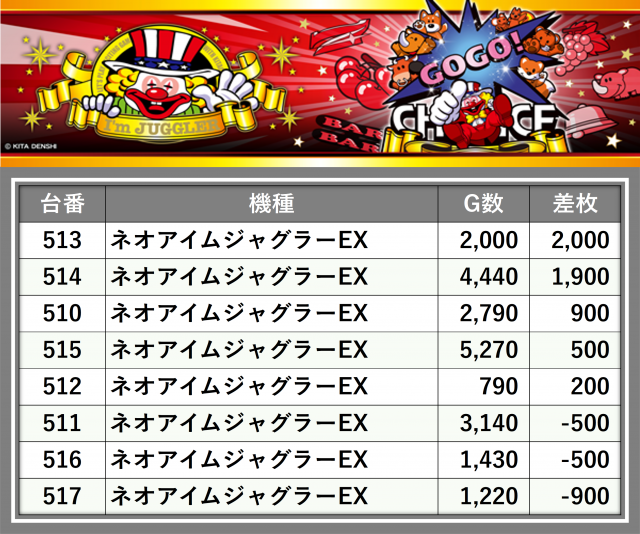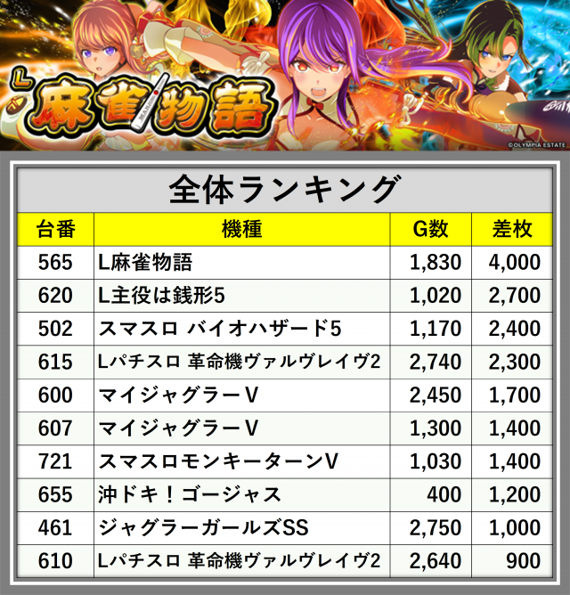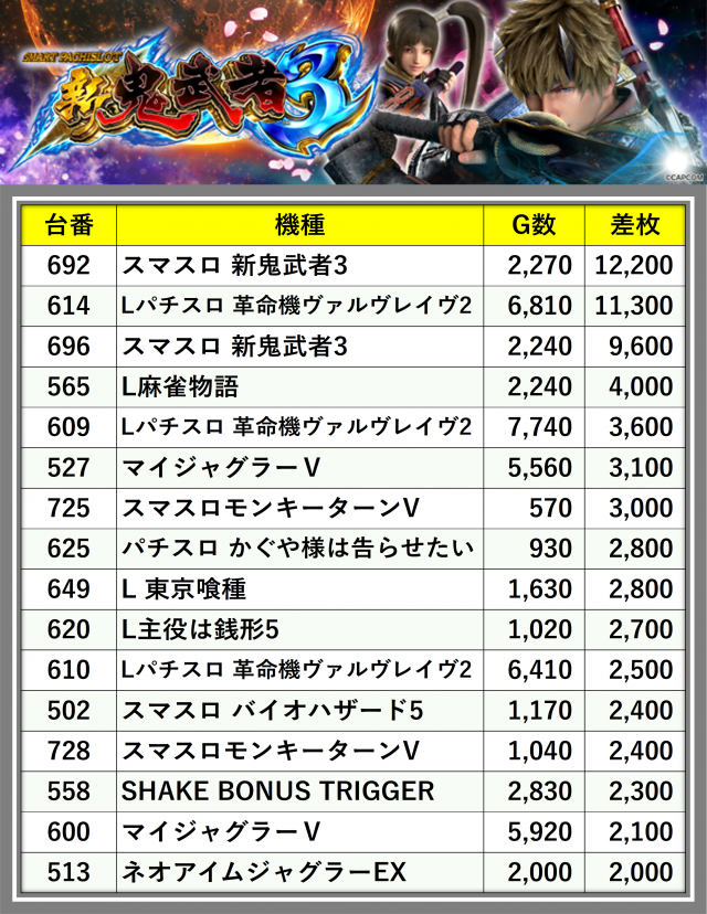 厳選された取材対象機種をはじめ、その他スロット全体から好記録が飛び出した!プレイヤーが楽しんだ1日を下記データにて振り返ってみて欲しい。