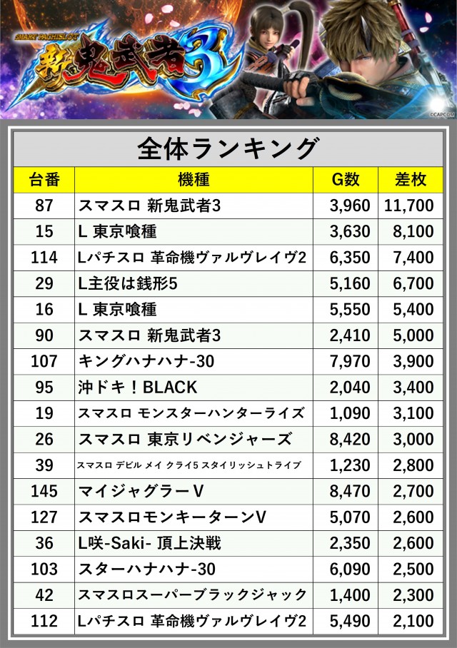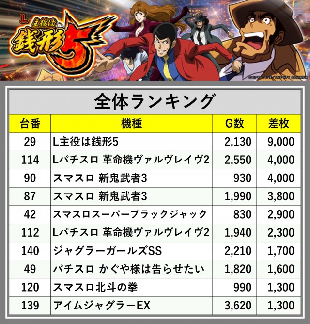厳選された取材対象機種をはじめ、その他スロット全体から好記録が飛び出した!プレイヤーが楽しんだ1日を下記データにて振り返ってみて欲しい。