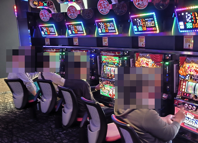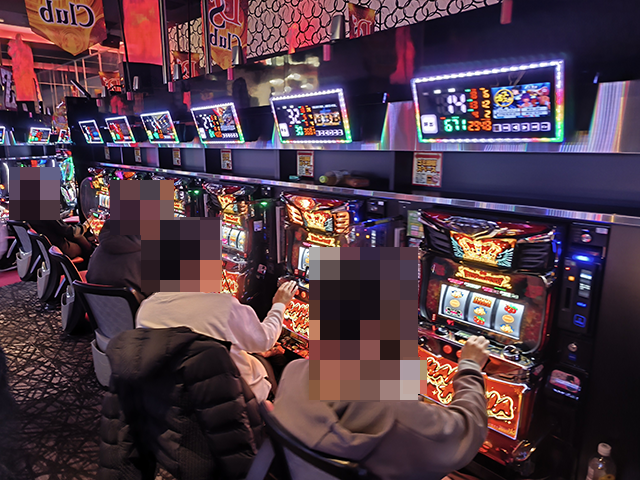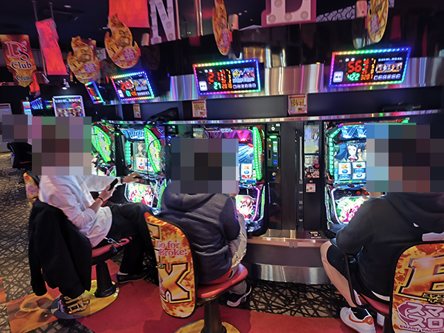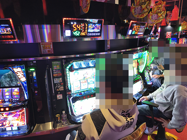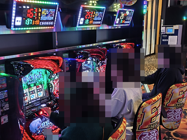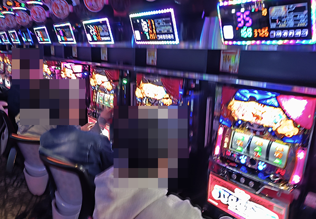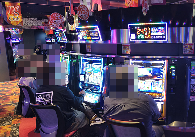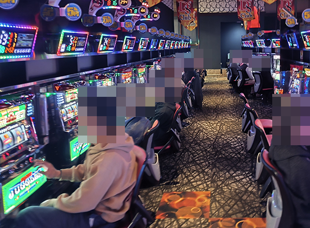 「ハッピージャグラーVⅢ」と「アイムジャグラーEX」、「ジャグラーガールズSS」のすべての台が稼働し、にぎやかな状況となっていた。