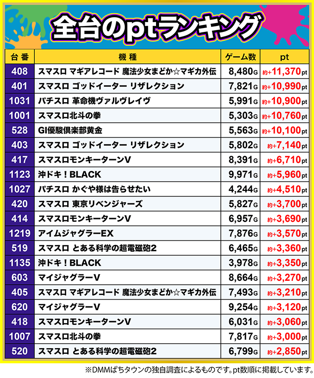 ほかにも、「スマスロ北斗の拳」の1001番台や「GI優駿倶楽部黄金」の528番台が約+10,000pt以上となった。