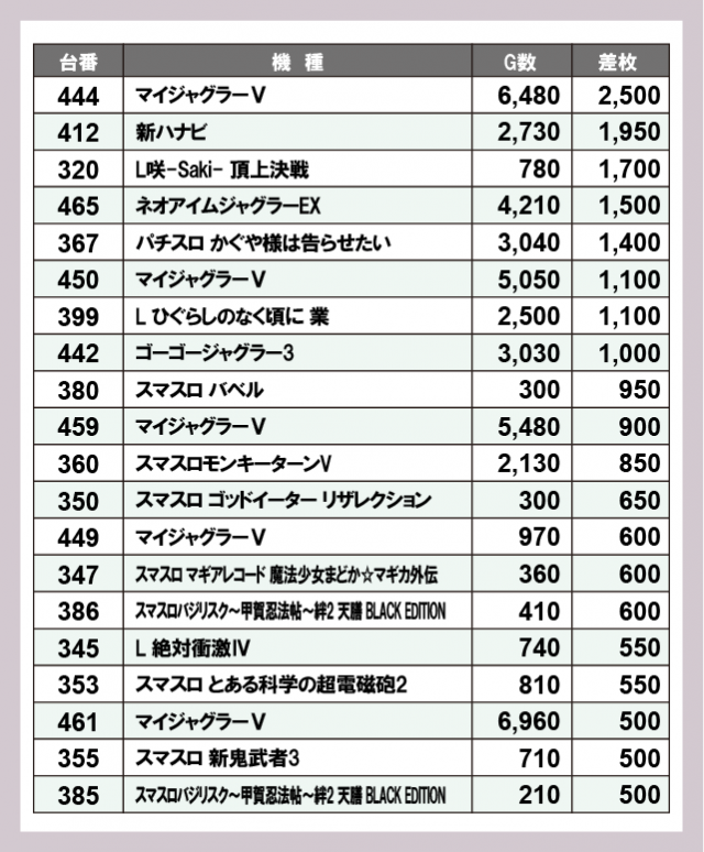 ※差枚数順に掲載しています