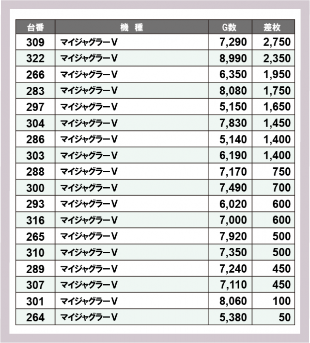 ※差枚数順に掲載しています