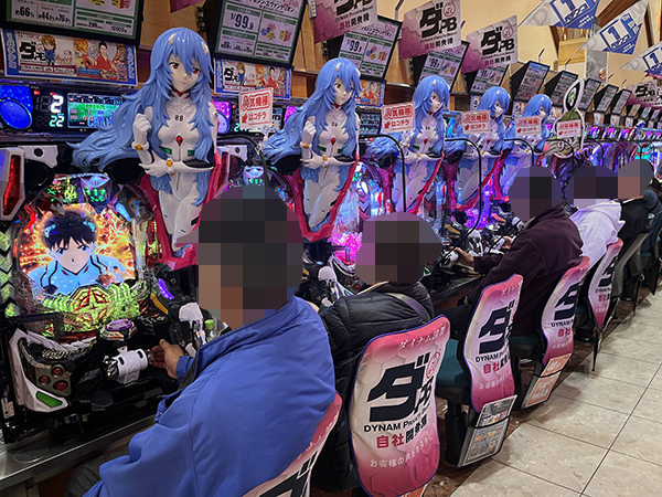 15時ごろの100円/89玉パチンコを見てみると、「PAコマコマ倶楽部 with 坂本冬美 ごらくバージョン」や「PAシン・エヴァンゲリオン 99 遊タイム付 ごらくver.」といった自社開発機が活況。プレイヤーの満足そうな表情から、充実した時間を過ごしていたことがうかがえる。