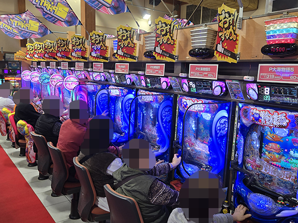 2.222円パチンコに目を移すと、「P大海物語5」や「Pスーパー海物語IN沖縄6」といった海物語シリーズに人気が集まっており、ほぼ満席となるほどのにぎわいを見せていた。
