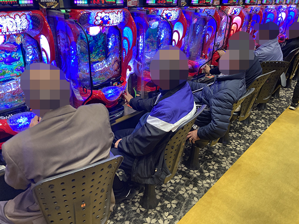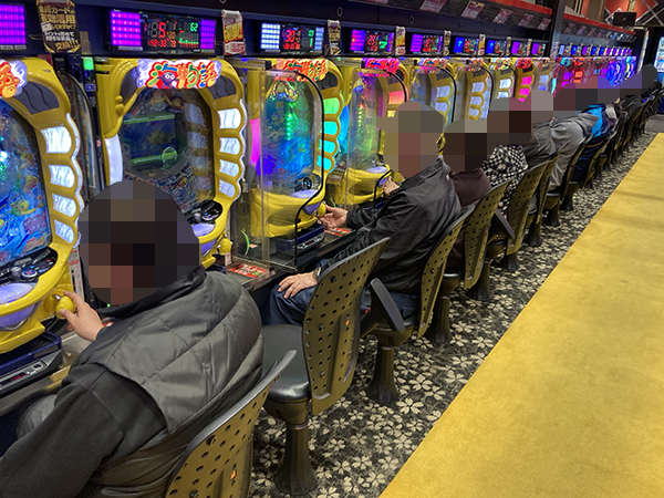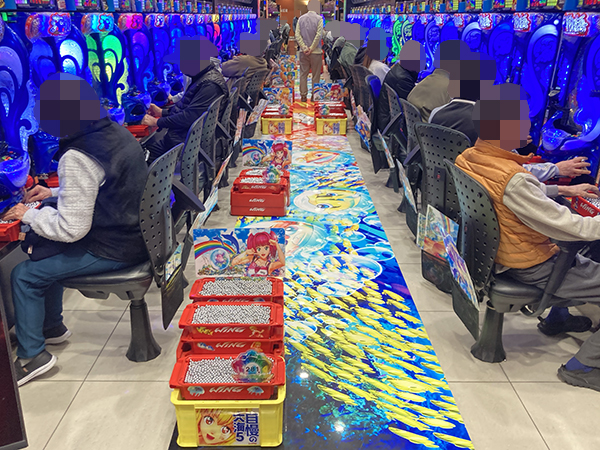 14時ごろの1円パチンコを見てみると、「PA大海物語5 Withアグネス・ラム」や「PA新海物語」といった甘海シリーズが活況。プレイヤーの満足そうな表情から、充実した時間を過ごしていたことがうかがえる。