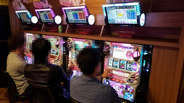 午後のピーク時の店内は、1階のジャグラーコーナーが満台。文字通り空台は無く、若者から年配層まで幅広い世代のプレイヤーがシンプルな告知演出を存分に満喫していた。