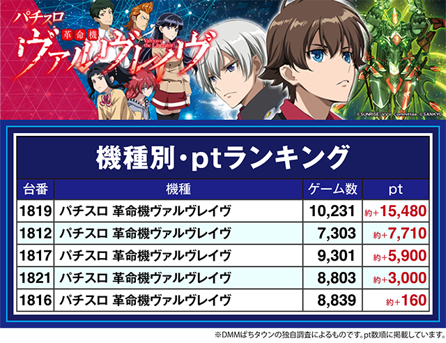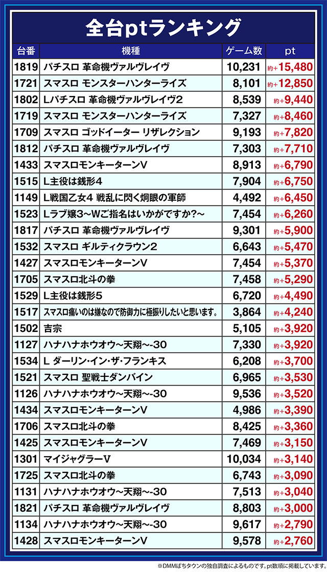 「パチスロ 革命機ヴァルヴレイヴ」の4台が約+3,000pt以上。