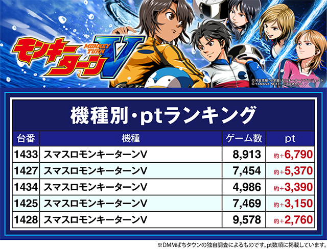 5台が約+2,700ptを超えた「スマスロモンキーターンV」では、1433番台が約+6,700ptオーバー。