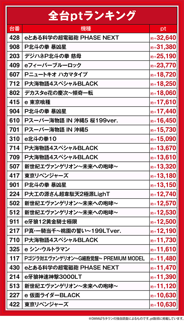 ほかにも、「デジハネP北斗の拳 慈母」の203番台や「eフィーバーブルーロック」の409番台が約+23,000ptオーバー。