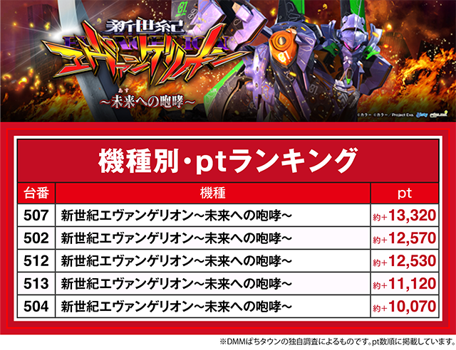 「新世紀エヴァンゲリオン~未来への咆哮~」の5台以上が約+10,000ptを超え、507番台は約+13,320ptを記録した。