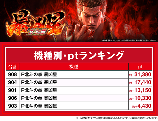「P北斗の拳 暴凶星」では、908番台が約+31,380pt。
