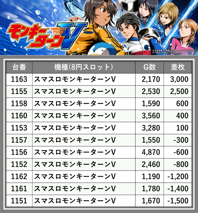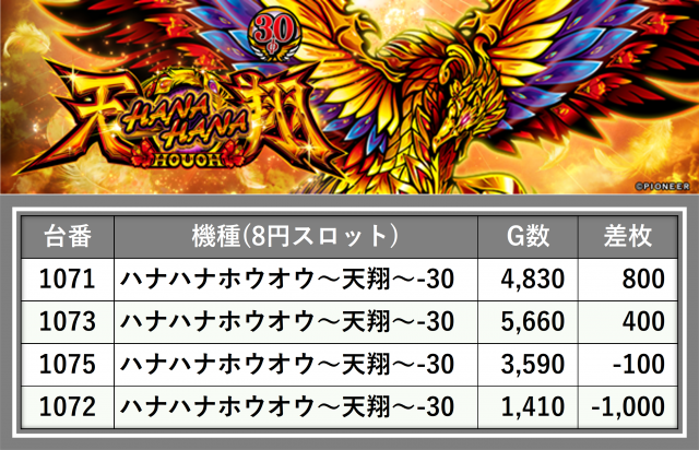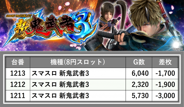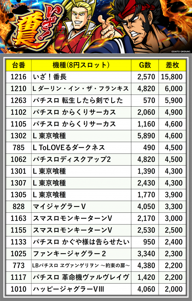 厳選された取材対象機種をはじめ、その他スロット全体から好記録が飛び出した!プレイヤーが楽しんだ1日を下記データにて振り返ってみて欲しい。