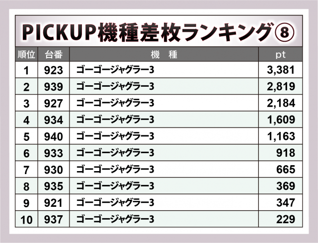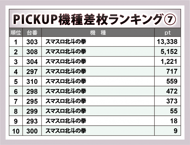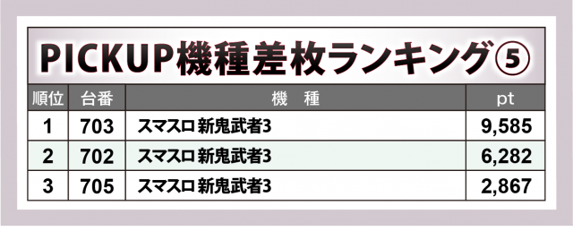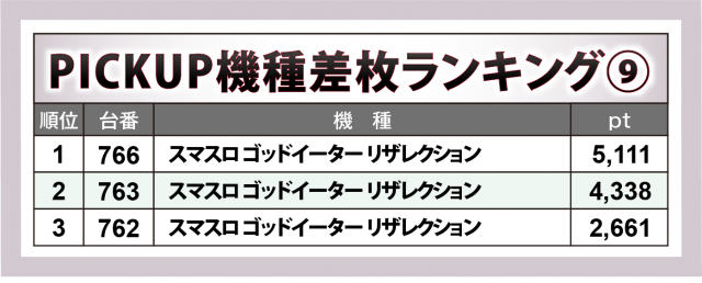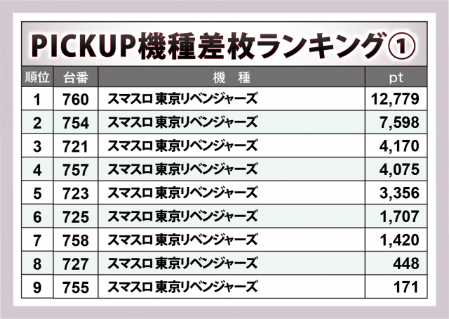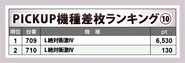 加えて、『L 東京喰種』777番台が+8千9百超、『スマスロ とある科学の超電磁砲2』979番台が+5千4百超、『沖ドキ!BLACK』656番台が+5千超と新旧入り乱れたラインナップが実力を発揮した。