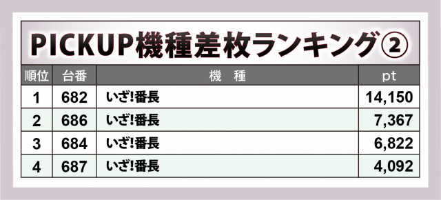 『いざ!番長』8台はちょうど半分の4台が勝利。しかも682番台が+1万4千2百弱で全401台の頂点に輝いた上に、+7千4百弱・+6千8百超・+4千1百弱が1台ずつと全てが4桁以上のプラスを収め、『東リベ』に匹敵する出来だった。
