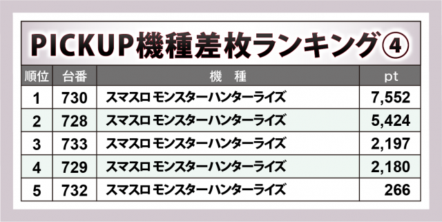 『スマスロ モンスターハンターライズ』は6台中5台がプラス。うち4台が4桁プラスで、+7千6百弱×1・+5千4百超×1・+2千2百弱×2と、好調台が連発した。