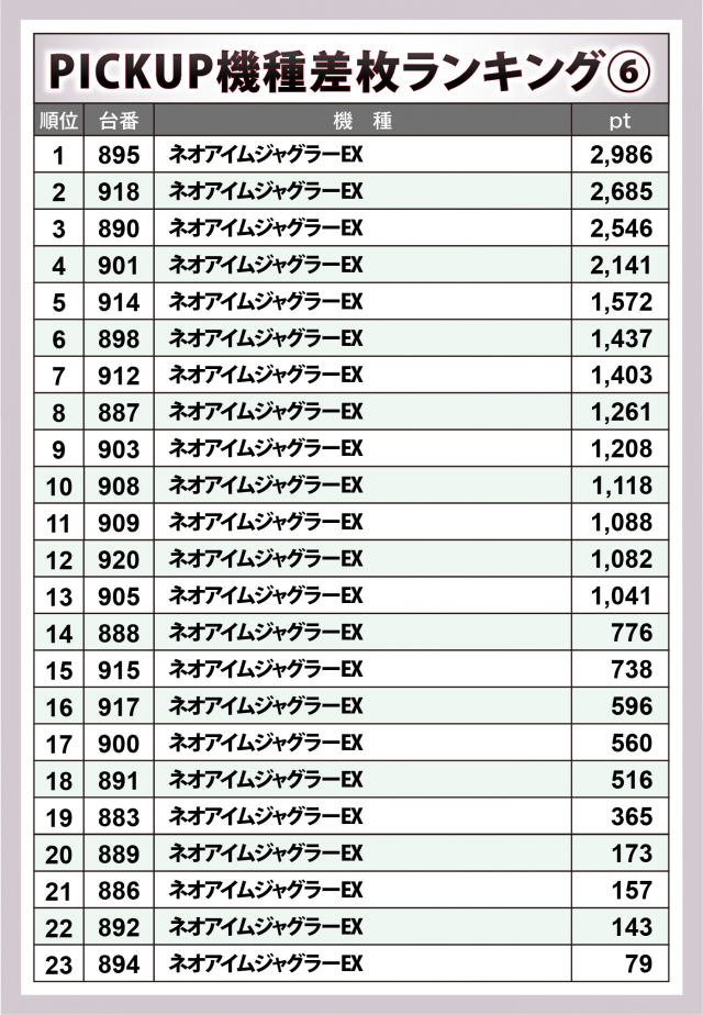 『ネオアイムジャグラーEX』40台ではpt数こそ+3千を超えた台はカウントされなかったものの、勝率の高さが際立った。