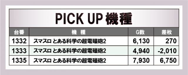 突出して目立っていたのが上表の3機種だ。『L 東京喰種』は高稼働を維持しつつ+13,820枚の強烈な差枚を叩き出し、ほかの台も安定したプラス域にまとめるなど、機種全体で存在感を示した。その勢いに呼応するように『Lパチスロ 革命機ヴァルヴレイヴ2』も+11,890枚を筆頭に複数台がしっかりプラスを刻み、分厚い結果を形成。さらに『スマスロ とある科学の超電磁砲2』も+6,750枚の好結果が飛び出し、機種のポテンシャルをしっかりと示す内容となった。