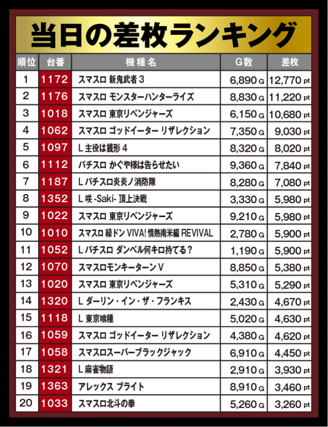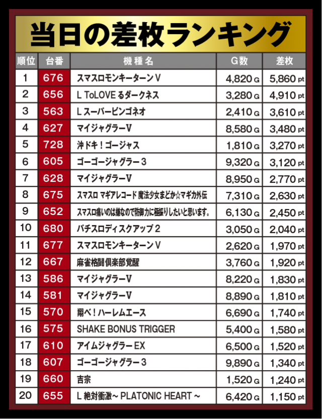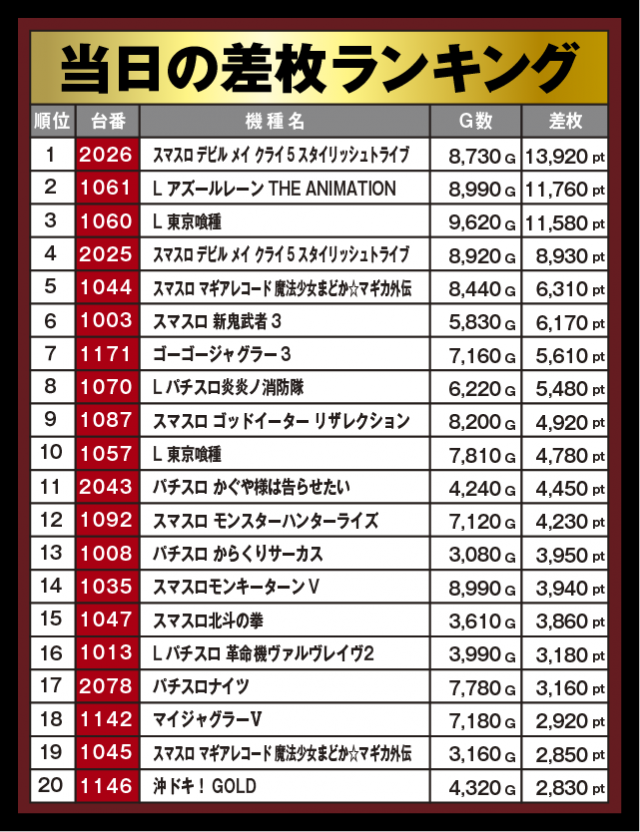 この日のSAPグループはひと味違う。DMMぱちタウンは、東京都内SAPの特別な3日間を一斉取材した。特に華々しい活躍を残した機種たちをピックアップして紹介しよう。まずは「SAP立川店」差枚ランキングの発表だ!