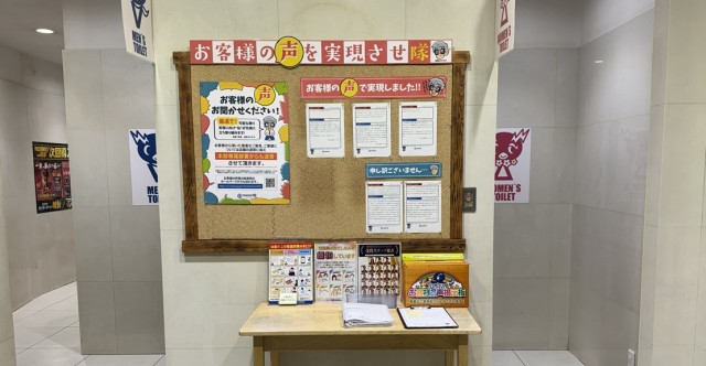 店内へ足を踏み入れると、色鮮やかな装飾と賑わいあるフロアが広がり、活気ある雰囲気がすぐに伝わってくる。景品コーナーでは、季節感たっぷりのクリスマス仕様で商品が並び、見ているだけでも楽しめる充実ぶり。お客様の声を反映した掲示板も設置されており、ユーザーへの配慮が行き届いた温かみのある空間が印象的だ。