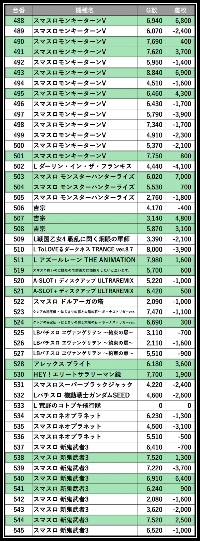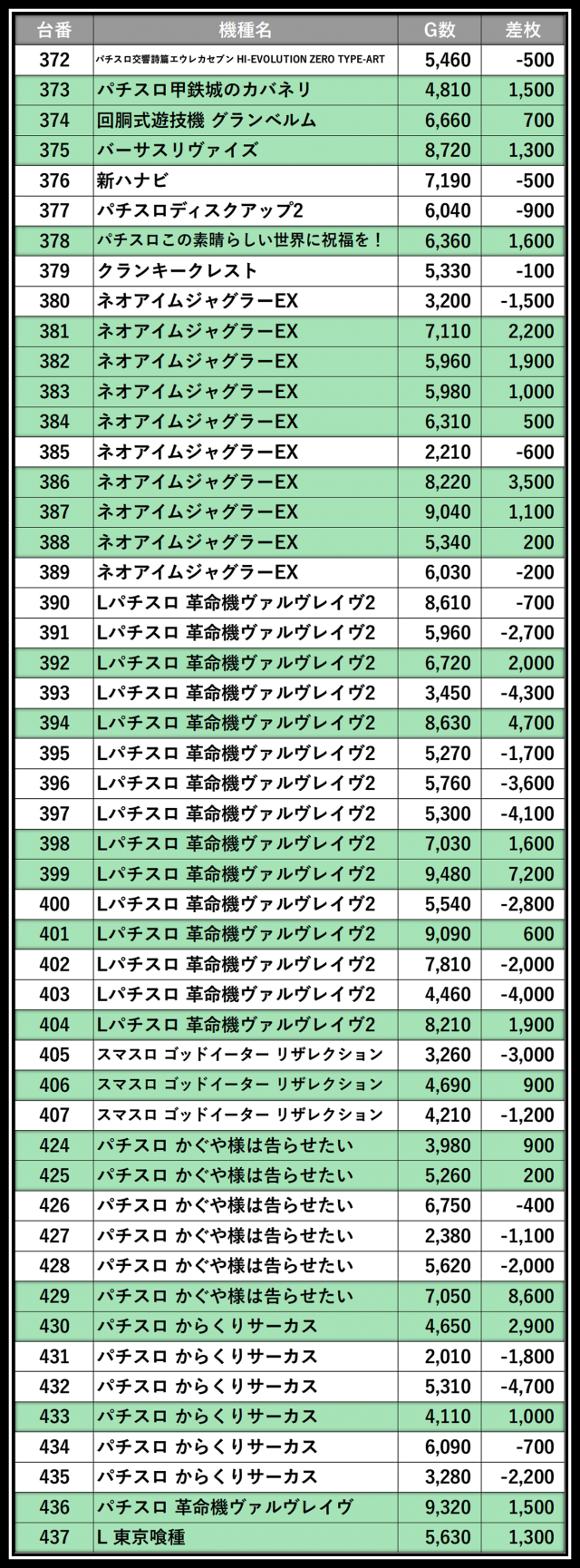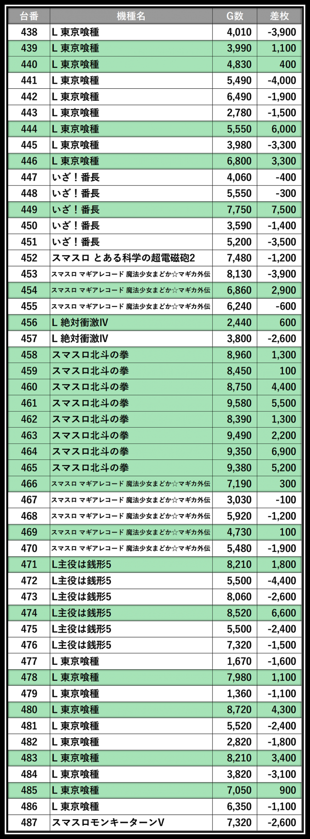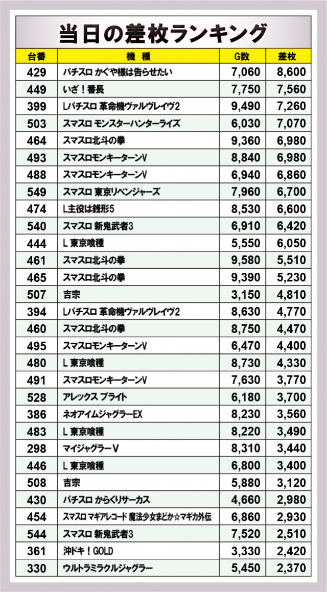 この日トップに立ったのは『パチスロ かぐや様は告らせたい』。7,060Gから+8,600枚と抜群の仕上がりを見せ、上位戦線を堂々とリードした。次いで『いざ!番長』が+7,560枚、『Lパチスロ 革命機ヴァルヴレイヴ2』が+7,260枚でランクインし、序盤からスマスロ勢が大幅な差枚を重ねていく展開に。また『スマスロモンキーターンV』や『スマスロ北斗の拳』なども複数台のしっかりとした伸びが確認でき、終日にわたり高水準の盛り上がりが続いていたことが窺える。